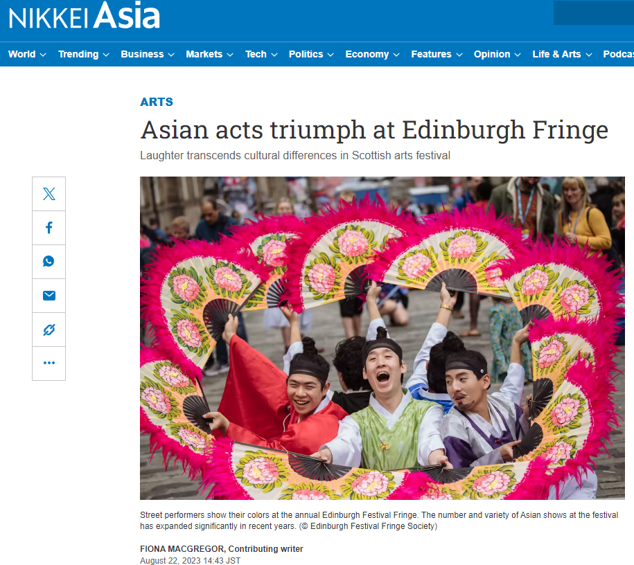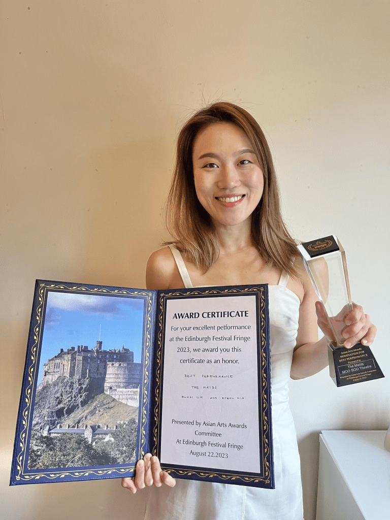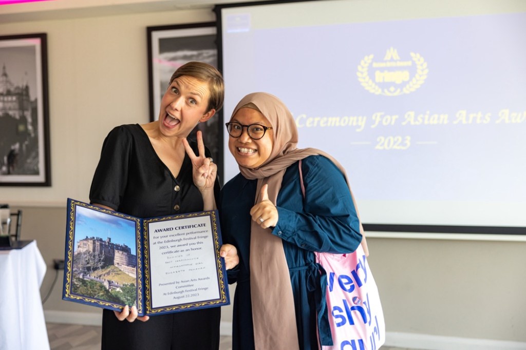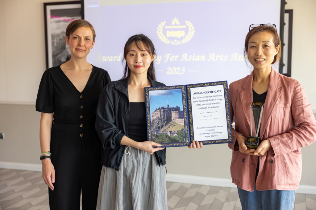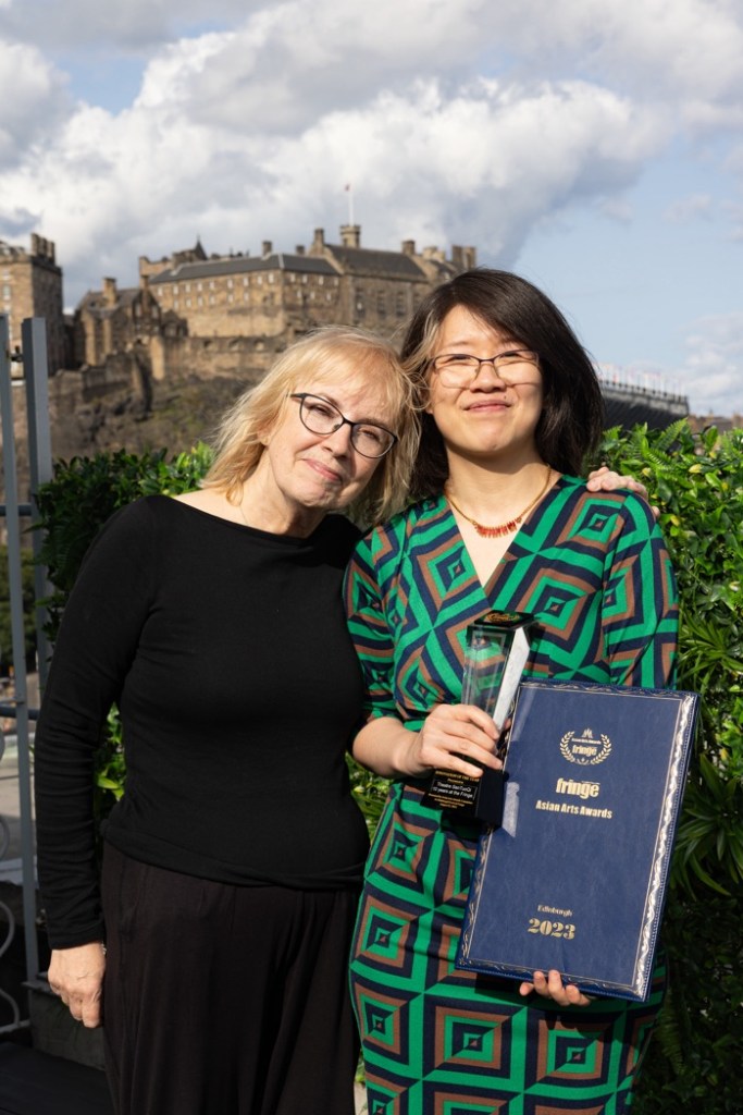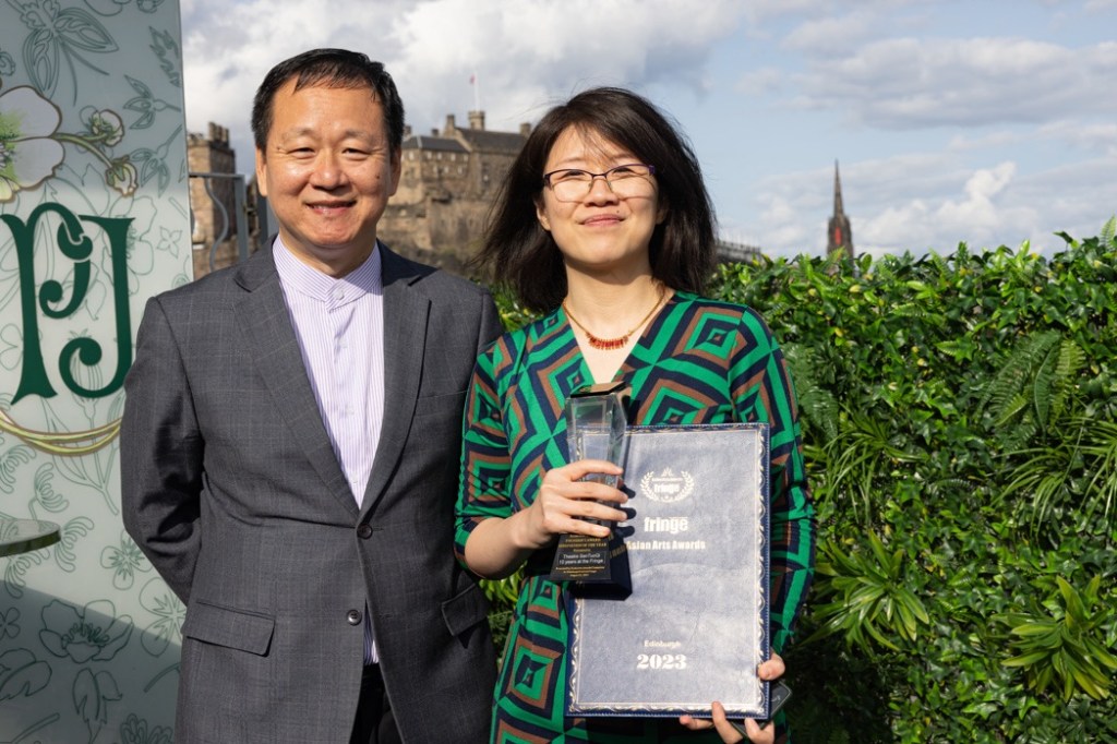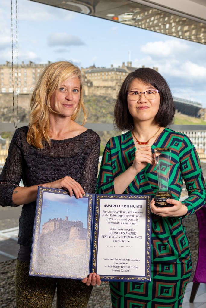 Asian Arts Special Award: Wang Yue from Mother Courage and Her Children (Theatre San Tuo Qi). She was rewarded with a special commendation for her outstanding performance in the lead role. Wang Yue is pictured with Eszter Marsalko from Asian Art Awards. The show was directed by Zhao Miao. This is his tenth anniversary of bringing shows to the Edinburgh Festival Fringe.